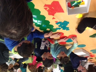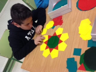 Figuras geométricas, mosaicos, teselaciones, simetrías,… invadieron todo. Aunque se podría decir que los mosaicos pertenecen al área de la geometría, con él se trabajan un montón de conceptos matemáticos además de los geométricos: simetría y eje de simetría, estimación de resultados, coordinación visual, concepto de superficie, representación espacial, giro,… además de la creatividad.